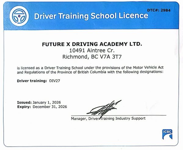At Future X Driving Academy, safety, professionalism, and personalized attention are our top priorities. Whether you are preparing for your ICBC Class 5 or Class 7 road test in Vancouver, Richmond, or Burnaby, we are here to support you every step of the way.